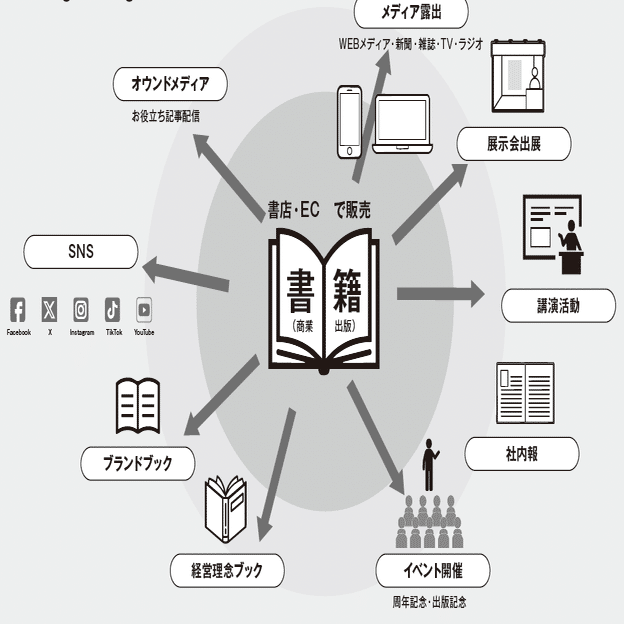 1冊の本を核に、SNS、講演、展示会、オウンドメディア、社内報などへと展開していく 。